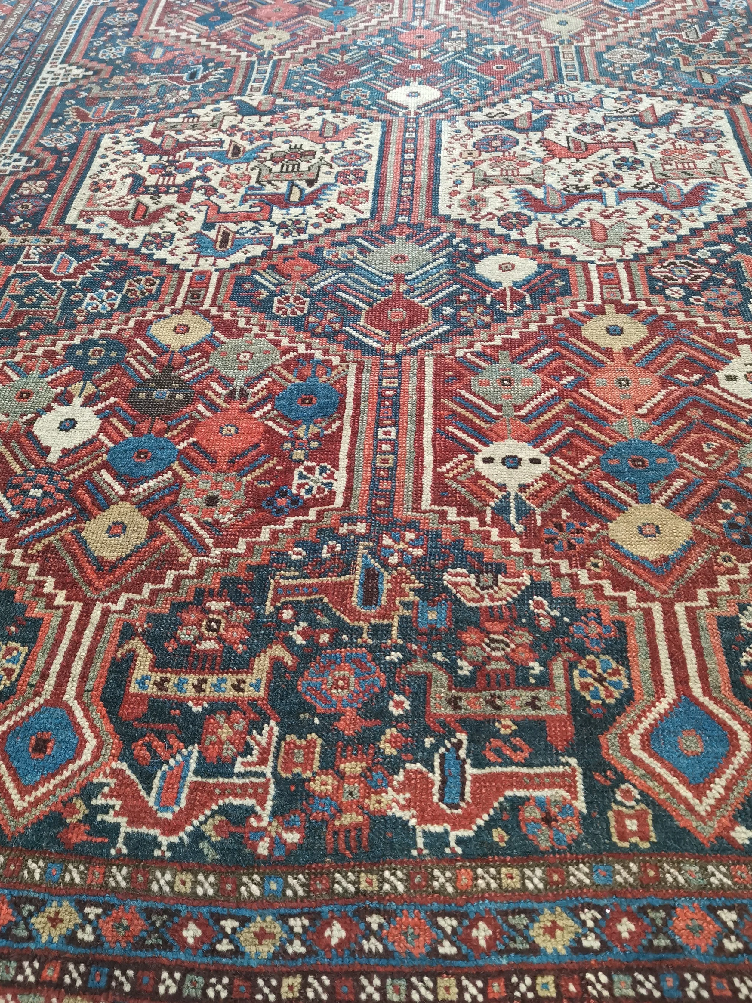An attractive and very affordable little Khamseh rug with a lively spread of animals including the typical Khamseh chicken which is a particular favourite of mine. The six stepped and conjoined hexagons are filled with floral designs to top and bottom with the middle pair showing chickens on a white ground. The surrounding field is crammed with more flowers and creatures except for the corners which hold crude boteh. The multiple narrow borders are lively and create a bold frame for the field. This is a lovely little rug with good colour and a lifetime of interest. These antique pieces, even less expensive ones such as this are in my opinion vastly superior to vintage and modern pieces and at this price they can also compete.