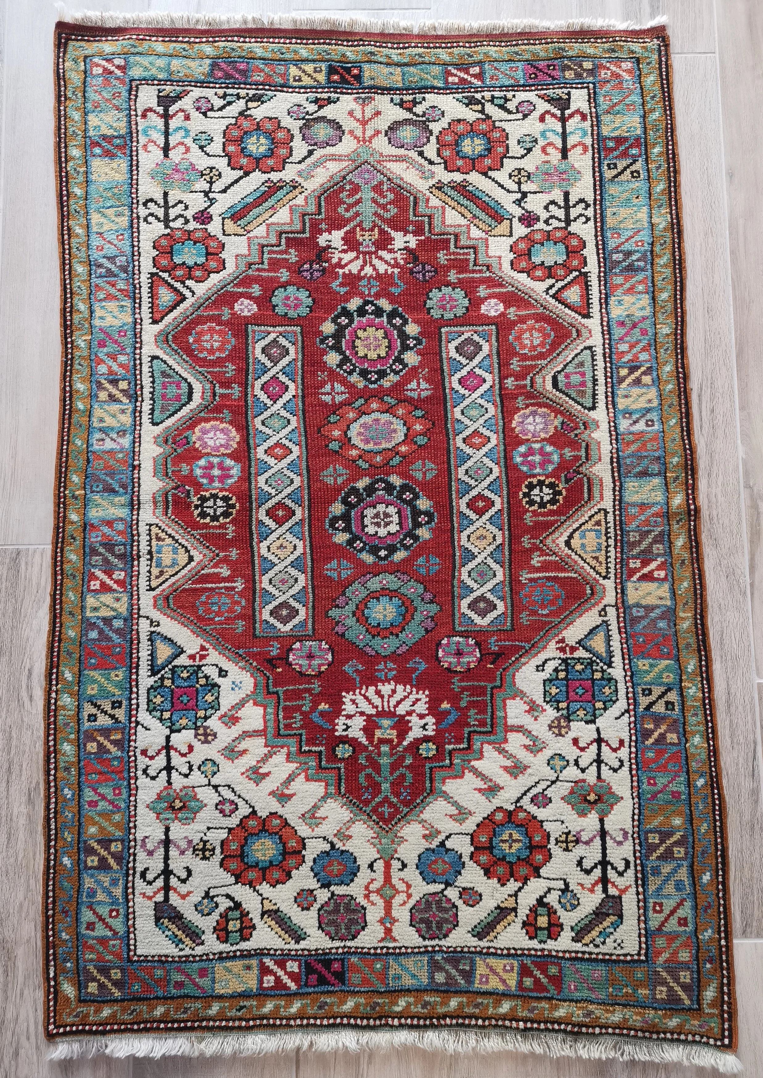 A rare and beautiful rug. These cottage industry pieces made in the western end of central Anatolia are hard to find and often in poor condition probably due to their soft woollen foundation. I would say this piece must have had some expert restoration during its life to be in this condition, good things are cared for and this is why in the main only the best things survive from the 19th century and beyond. I could run out of superlatives describing this rug. The range of colours is something to behold, each one a jewel with the pure white background showing them off beautifully. The central red field holds four rich rosettes flanked by two columns with a spiral of diamonds. The floral spray at top and bottom reminiscent of the flowers seen on the borders of Kula rugs. The wool is soft and the rug is very floppy. I could go on but I think the pictures say enough, a very attractive and collectable piece.