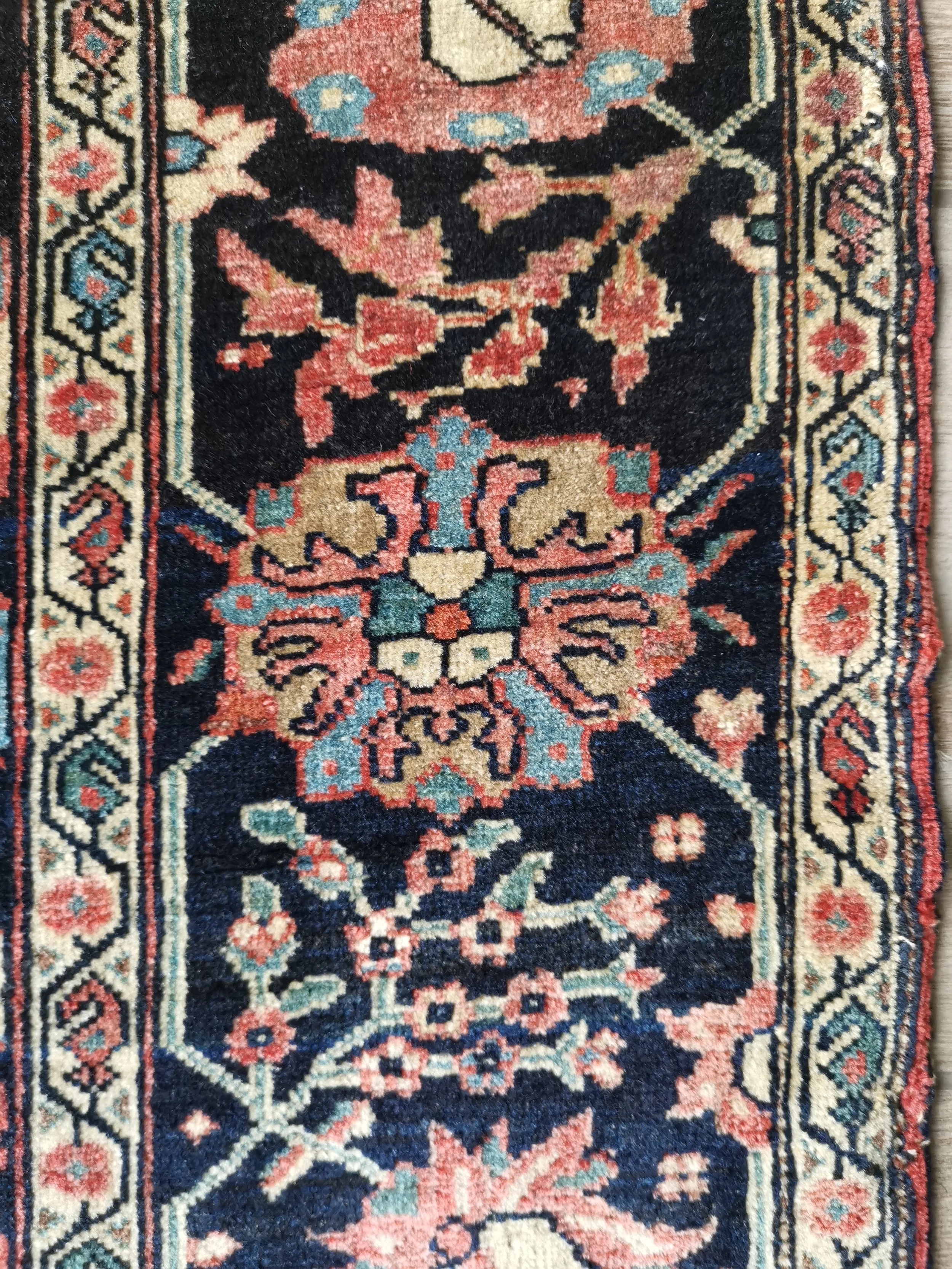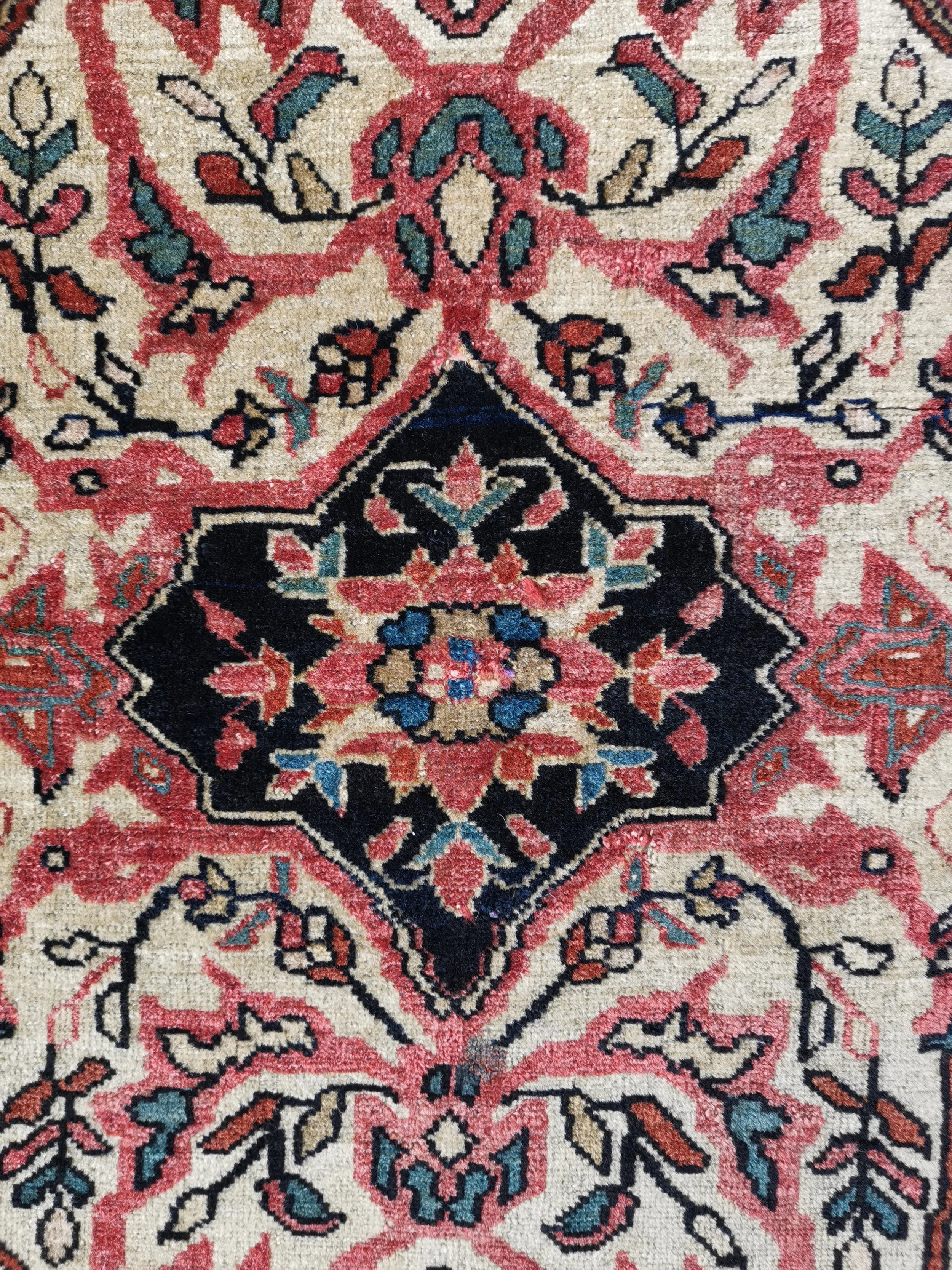 The sides have curled under in places as is common on Sarouk rugs. There is an area of damage with possibly some old repair in the red field.